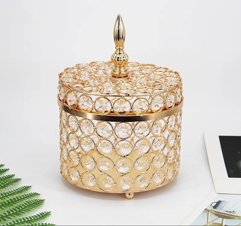 Description Product informationProduct name: European Crystal Storage Jars and Lid Material: Metal/GlassPurpose: Storage Tank, Candy Jar, Jewelry Box Cosmetic...