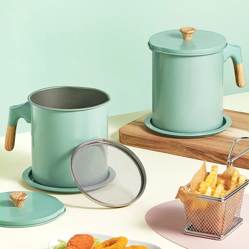 Wooden Handle Oil Strainer, 1.4L Stainless Steel Oil Filter Pot with Tray,