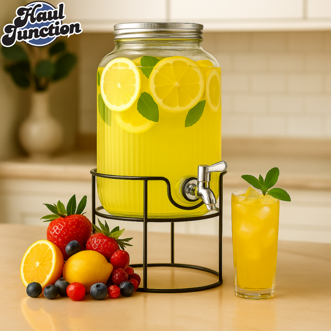 ELEGANT GLASS WATER BEVERAGES DISPENSER 8 LITRES - METAL STAND