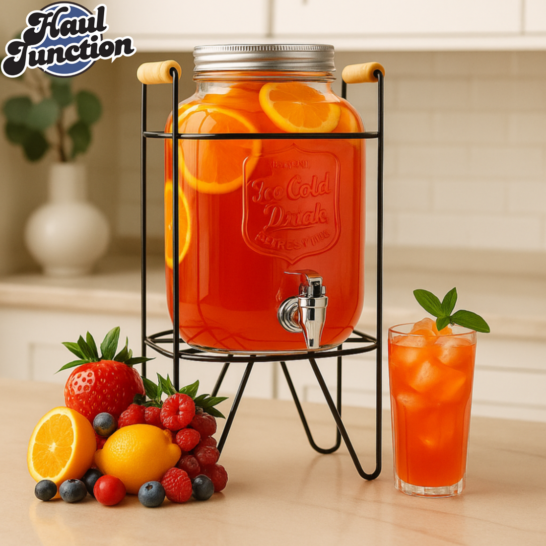 ELEGANT GLASS WATER BEVERAGES DISPENSER 8 LITRES - METAL STAND CAGE