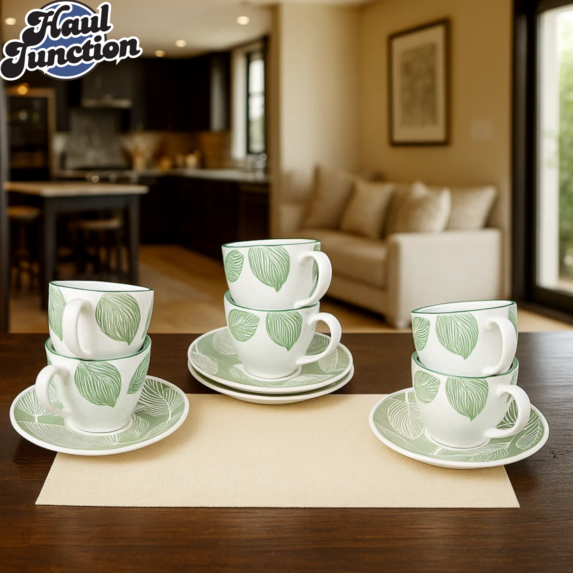 200ML 6PIECE CERAMIC CUP & SAUCER SET – GREEN LEAF DESIGN FOR LUXURY KITCHEN SERVING