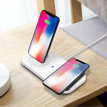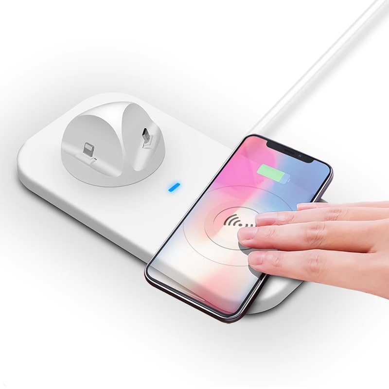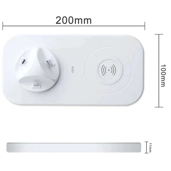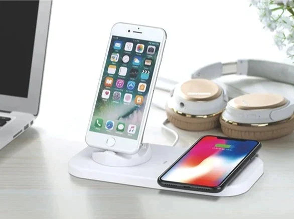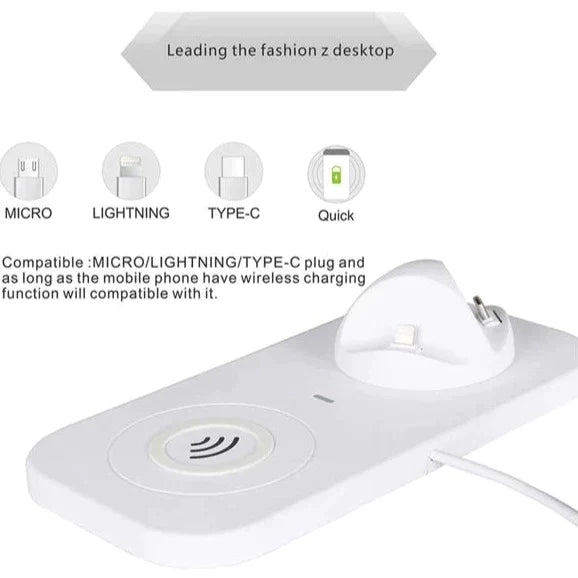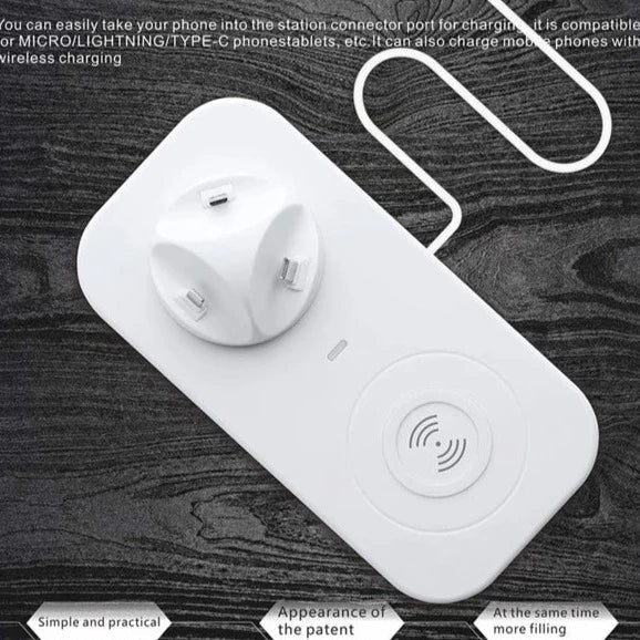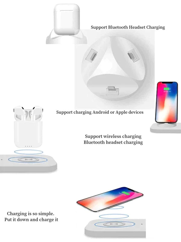 This 4 in 1 charging station with Micro USB & For iPhone & Type-C. Base plug can be adjusted 330-degree rotation and 15-degree tilt for enjoying videos. It ha compact portable design, the dock helps your device fast charge wherever you go. Wireless charger for Qi-enabled device or device equipped with a Qi-compatible cover, no cables or USB interface required.