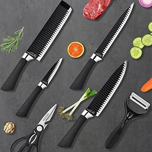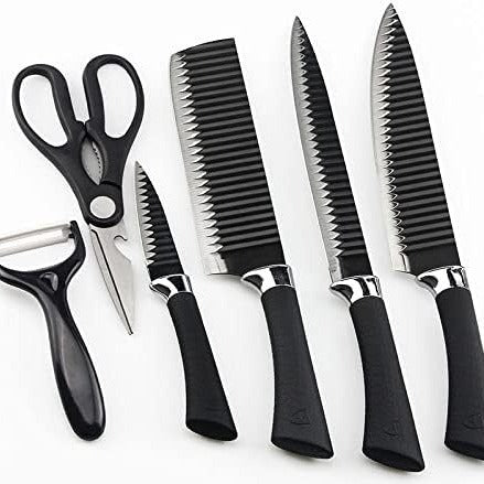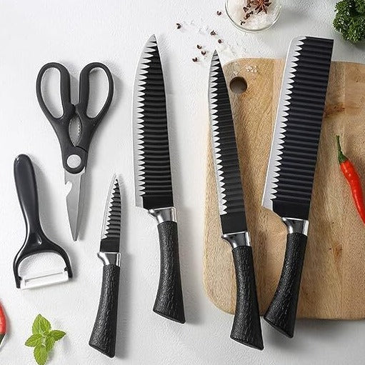 Upgrade your kitchen with HaulJunction's 6 Pcs Stainless Steel Black Knife Set. Featuring sleek black titanium-coated blades and ergonomic handles, this set combines style and efficiency.