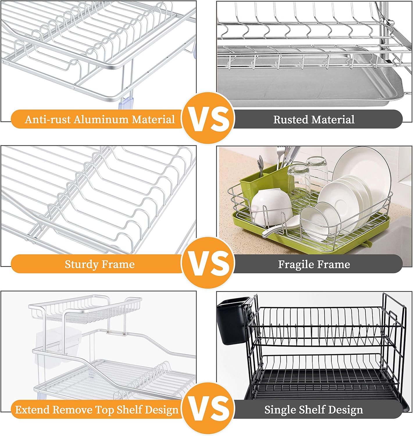 - High Quality --- This dish rack is made of aluminum which has excellent resistance to rust .Better than most products on the market The side has plastic cup holder and drainer tray board.High quality material also sturdy enough!