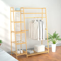 - This multifunctional coat hanger is equipped with 1 top shelf,1 hanging rod,1 bottom shelf, 5-tier storage shelf to give you more storage options! Top hollow shelf, expand the storage area, make full use of space. Top rod provides sufficient space to hang any long pants, overcoats and dresses without wrinkles. Widen and thicken bottom shelf is convenient to organize shoes, box, suitcases, 5 tires storage shelves are handy for keeping hats, handbags, towels, get rid of confusion