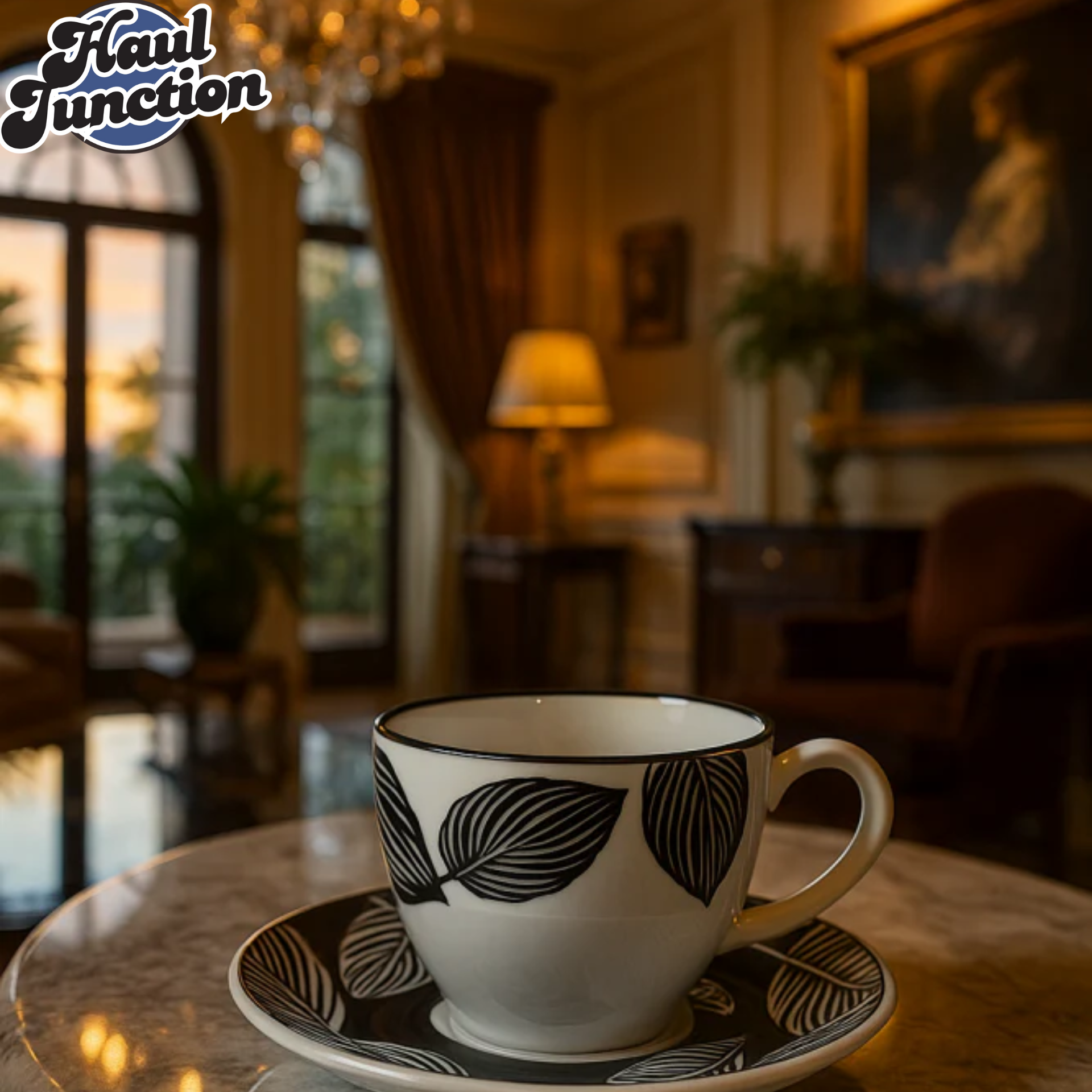 Elevate your tea moments with this elegant black leaf design ceramic tea cup and saucer. Crafted for those who appreciate style and sophistication, this set features a bold monochrome botanical pattern and a smooth glazed finish. Perfectly styled for luxury villas or premium dining settings, it adds a touch of class to your home or gift collection.
