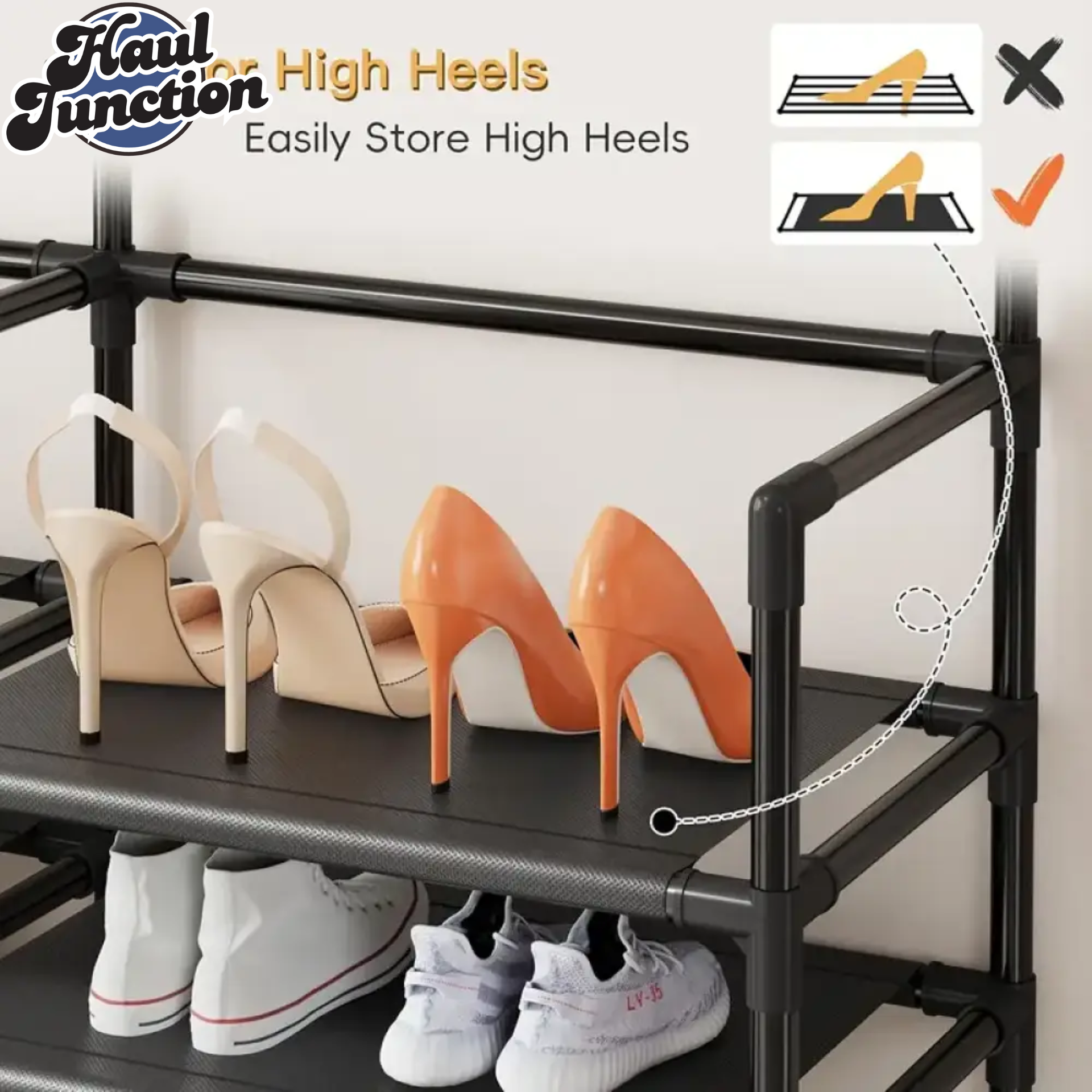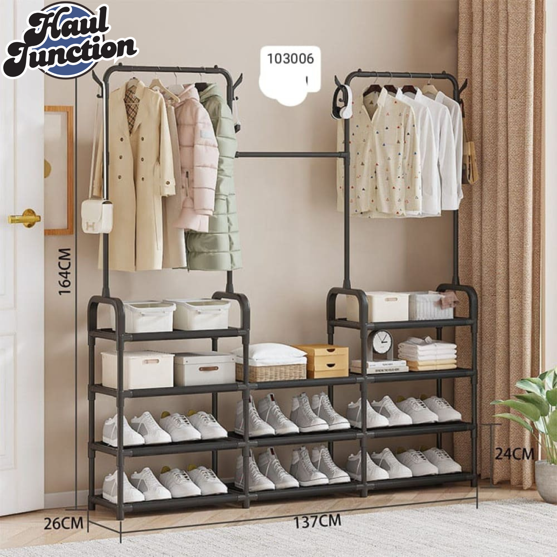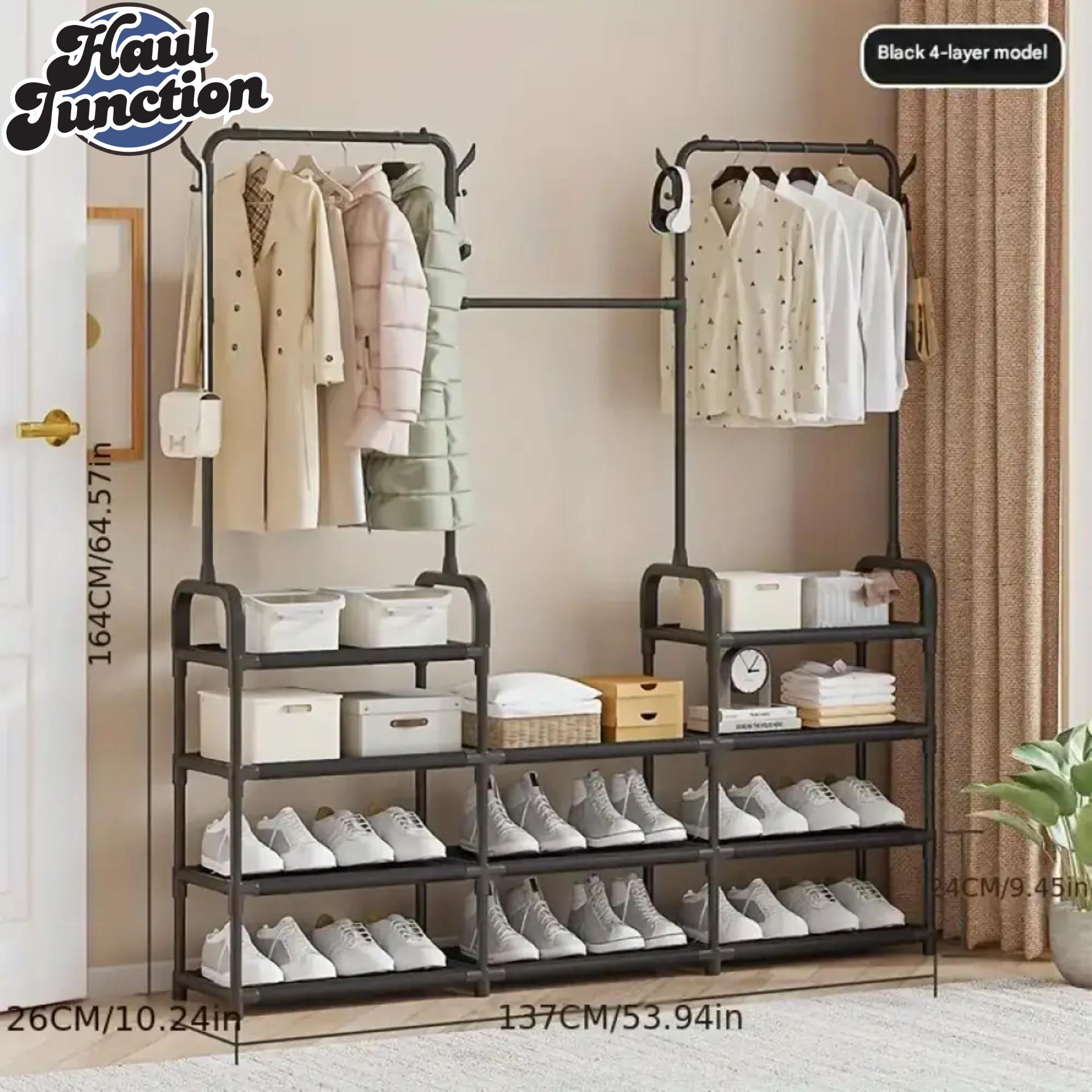 This elegant 3-tier black wardrobe closet organizer enhances bedroom and entryway storage with its sleek, space-saving design. Engineered for hanging clothes, it efficiently maximizes vertical space while keeping garments accessible and wrinkle-free. Ideal for organizing everyday wear or seasonal items, this sturdy rack combines style and practicality to streamline your storage needs without compromising on aesthetics.