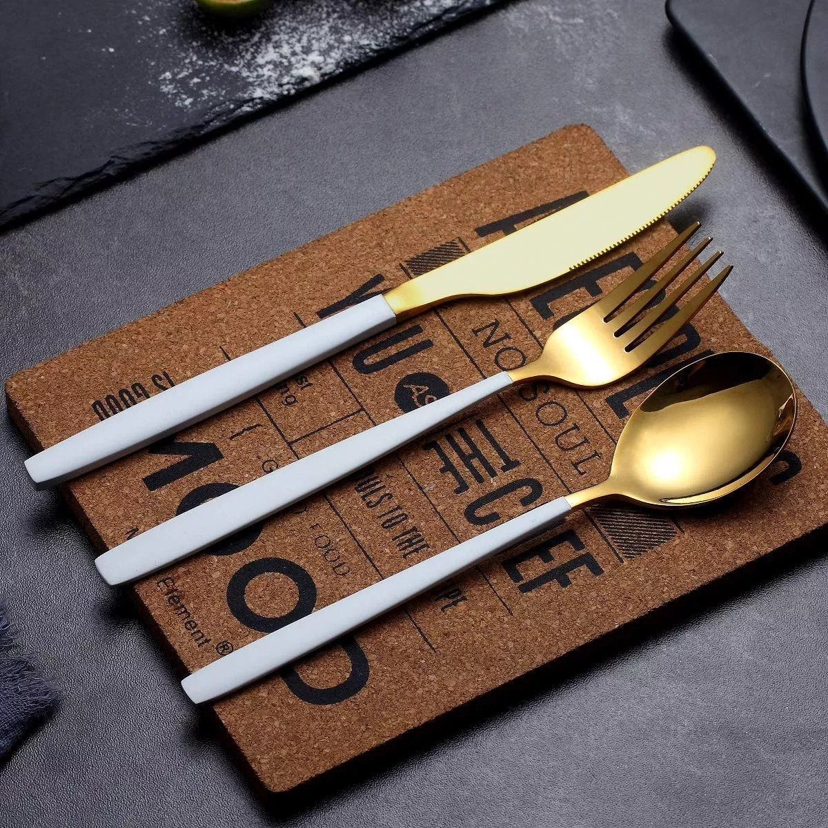Flatware Cutlery Set, Stainless Steel Utensils Service Set for 6, Mirror Finish, Dishwasher Safe With Golden Spoon and White Handle