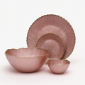A stunning and highly decorative 14 pieces serving collection featuring a rich, textured metallic rose gold or shimmering pink finish and decorative, wavy 'petal' edges with a beautiful gold trim. Made from a durable material (likely resin or heavy plastic with a metallic glaze), the pieces are designed with a radiant, hammered texture that radiates from the center. This set is perfect for adding a touch of luxury, romance, and dramatic color to special occasion dining or as high-impact decorative accents.