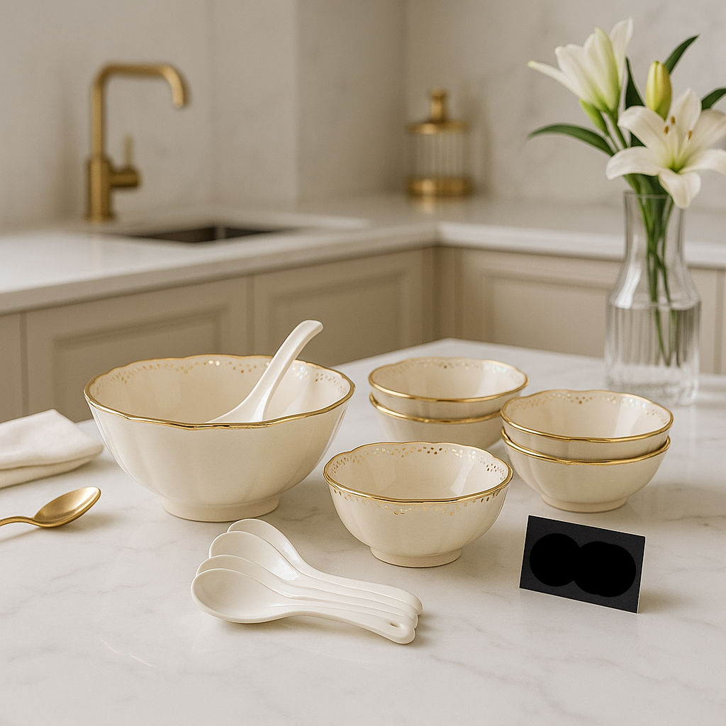 Luxury 14-Piece Porcelain Soup Set – Premium Cream & Gold Bowls with Spoons