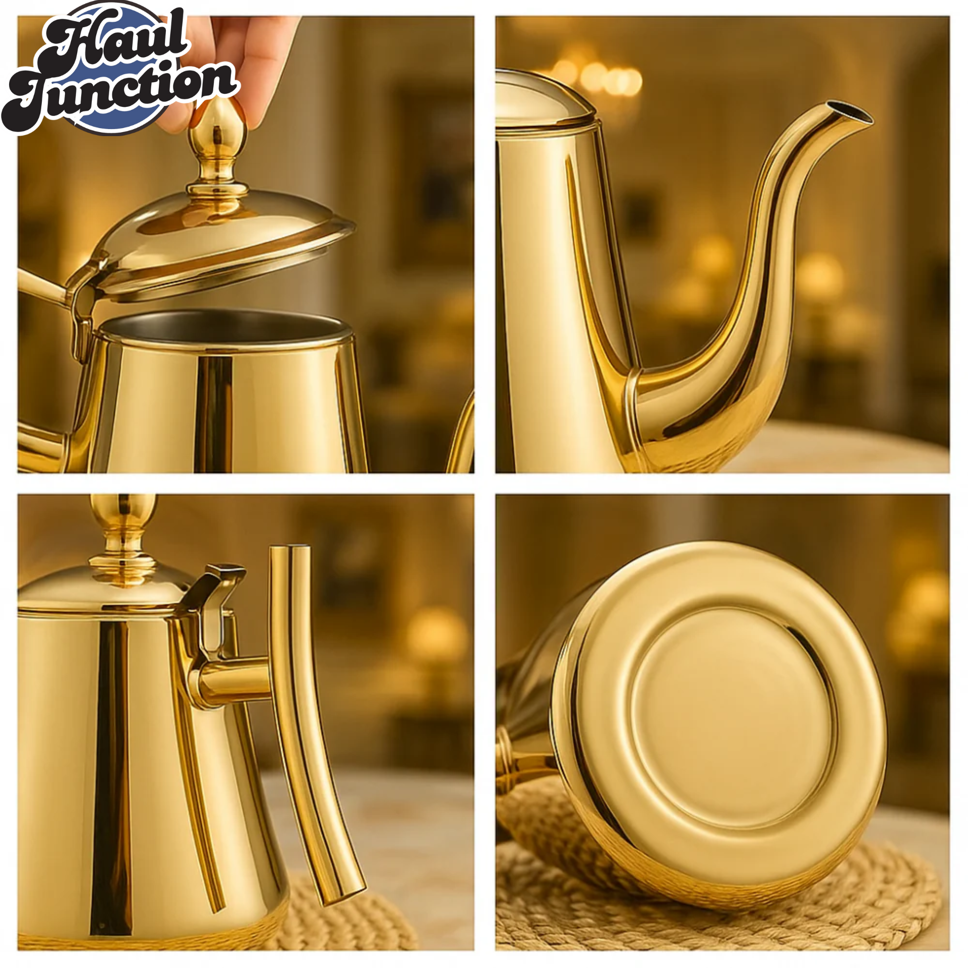 Perfect for serving guests during tea time, making pour-over coffee, or keeping hot water ready for chai and green tea, this stainless steel kettle brings convenience and class to every home. Whether it’s a morning coffee ritual, evening chai with family, or hosting guests on weekends, the golden finish adds a royal charm to your table.