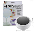 a button at the bottom of the stand, you can power up LED lights that will illuminate both sides. When you are finished, My Foldaway Mirror will collapse back down into the base for easy storage and transportation. When the mirror is extended there are compartments where you can store small accessories such as hair ties or clips. The is a mirror that can be quickly folded out and used in any room of the house. It rests on its own stand and will also swivel and rotate. This mirror is double-sided, with one side giving you a realistic view of your face while the other side will show it at 10 times the size. What's more, with the press of a button at the bottom of the stand, you can power up LED lights that will illuminate both sides. When you are finished, will collapse back down into the base for easy storage and transportation. When the mirror is extended there are compartments where you can store small access 7X such as hair ties or clips.