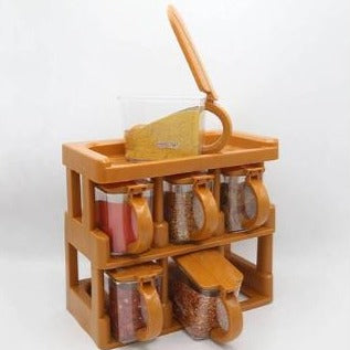 This set of spice rack and spice jars is made from absolute premium quality plastic material. It will looks great in any kitchen and is useful to any cook who wants to keep spices handy. It comes with 6 beautifully designed spice jars with large curvy handles. Each jar has a spoon within it. It make room for an extra shelf at the top to add additional space in your kitchen.