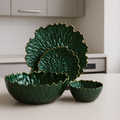 An absolutely stunning and high-impact 14 piece serving collection featuring a rich, textured emerald green finish and decorative, wavy 'petal' edges outlined in a luxurious gold metallic trim. The set includes two shallow plates or chargers and two deep serving bowls in varying sizes, all featuring a unique, detailed surface texture that resembles a hammered or distressed finish. This set is perfect for adding a touch of bold color, luxury, and botanical elegance to holiday tables, formal dining, or as eye-catching decorative accents.