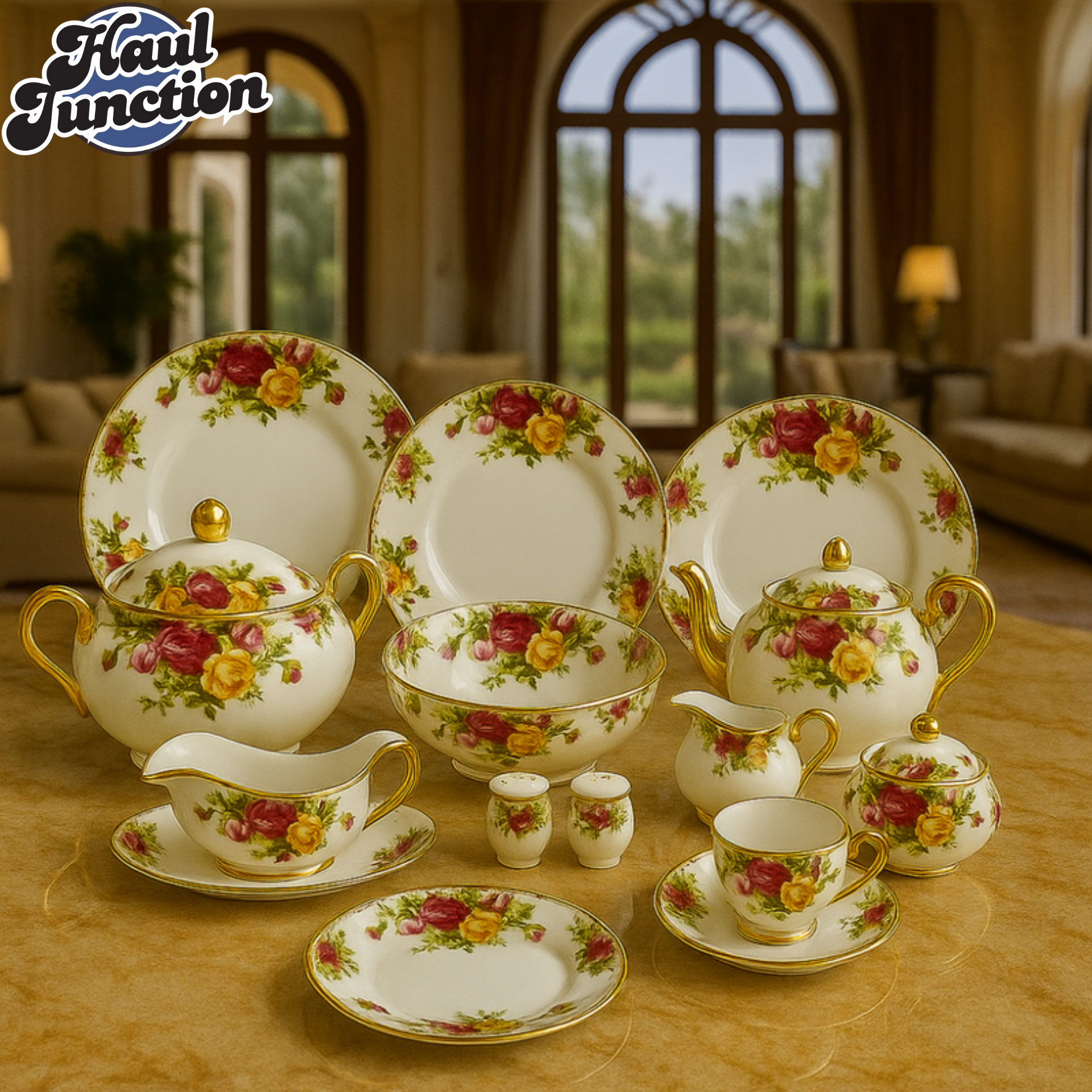 ROYAL ALBERT FINE BONE CHINA 75-PIECE DINNER SET – FLORAL GOLD TRIM TABLEWARE WITH PLATES, BOWLS, TEA SET & SERVING DISHES - 416F