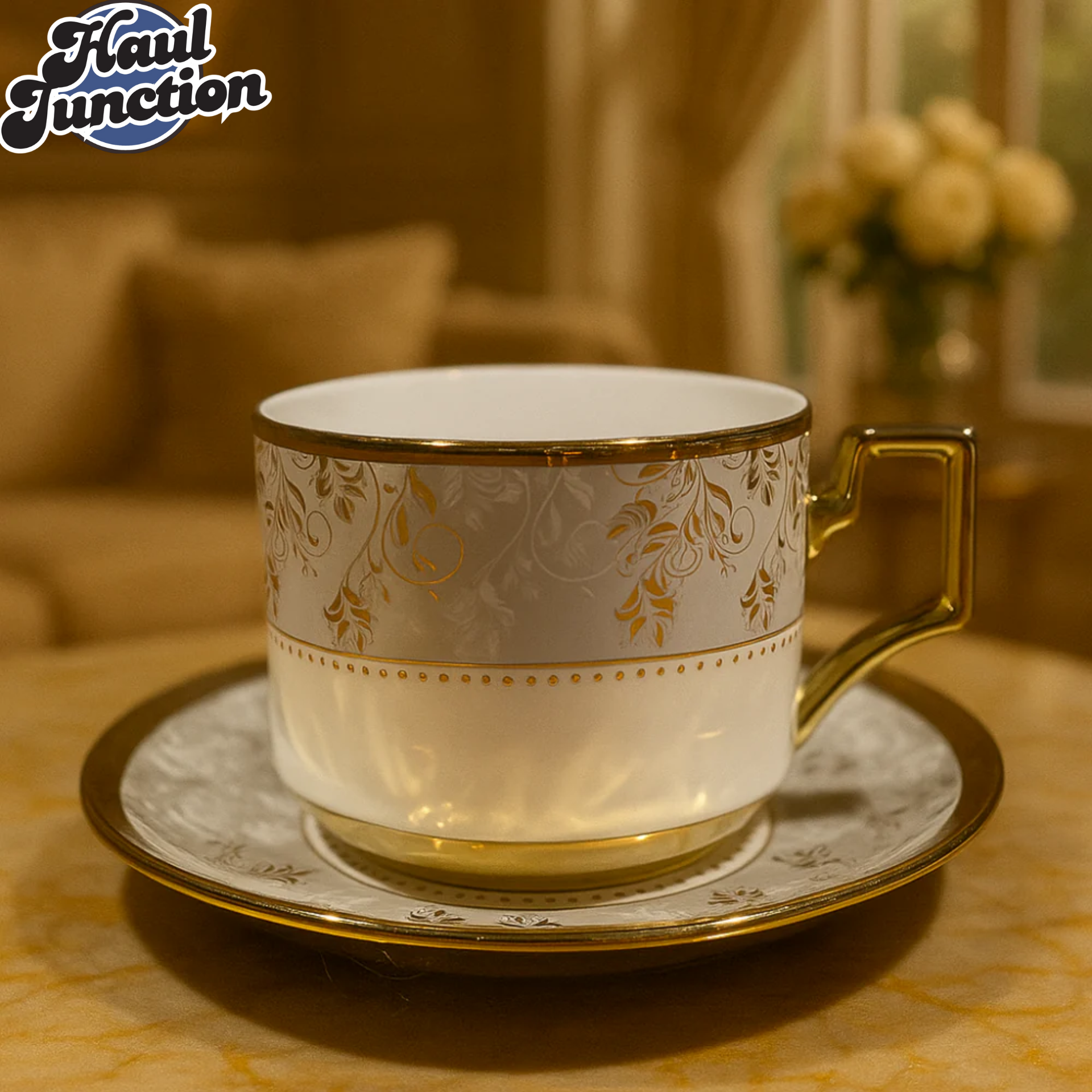 Bring royal elegance to your tea table with the Royal Fine Bone China Cup & Saucer Set – Luxury Gold Handle Edition, exclusively available at HaulJunction. This premium 12-piece set includes 6 cups and 6 matching saucers, beautifully crafted from fine bone china to deliver timeless sophistication and durability. Each cup is adorned with luxurious gold detailing and a polished gold handle that adds a touch of royalty to every serving — perfect for tea, coffee, or espresso lovers who value fine design and lasting quality.