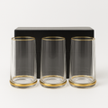 A modern and elegant set of six tall drinking vessels featuring subtle, parallel vertical ribbing that creates a refined texture and enhances grip. The clean, slightly tapered shape is finished with luxurious gold accents encircling both the rim and the base, making them perfect for everyday beverages or elegant entertaining.